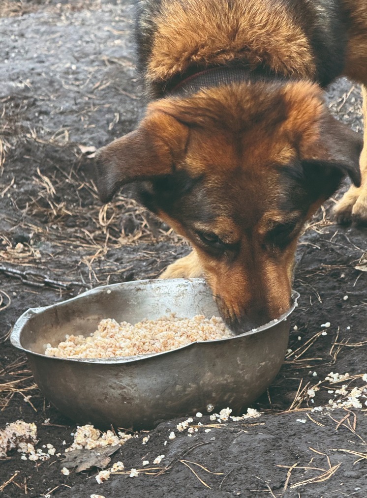Следующий после варки этап — кормление. И здесь, чем больше добровольцев, тем лучше. Кашу нужно смешать с мясом, быстро разнести по будкам. Зимой это особенно тяжело: тёплая похлёбка стремительно остывает на морозе, а территория «Преданного друга» достаточно большая, чтобы за несколько минут управиться вдвоём.