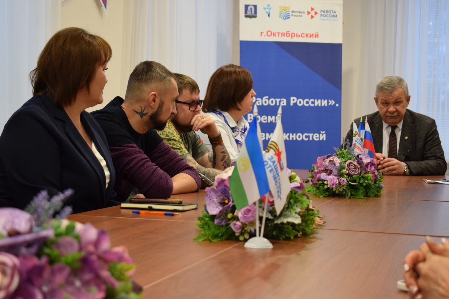 В мероприятии также приняли участие директор центра занятости населения Октябрьского Дарья Попова, депутат Совета ГО Наталия Соболева, соцкоординатор фонда «Защитники Отечества» Венера Кречетова и председатель комитета по спорту и физкультуре администрации Ильдар Карипов. Он рассказал, какие спортзалы города принимают участников и ветеранов спецоперации.