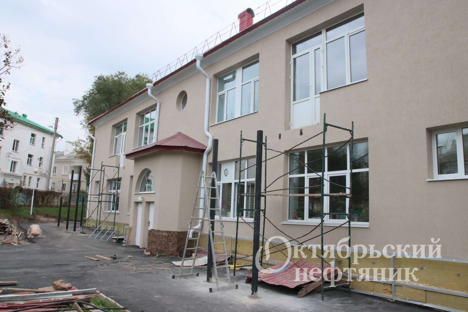 Уже видно, насколько преобразилось здание советской эпохи. В течение лета строители утеплили его, нанесли фасадную штукатурку. Вместо старых окон — новые пластиковые конструкции. Оборудованы несколько эвакуационных выходов, отвечающих требуемым нормативам. Сейчас специалисты крепят лепнину и балясины.