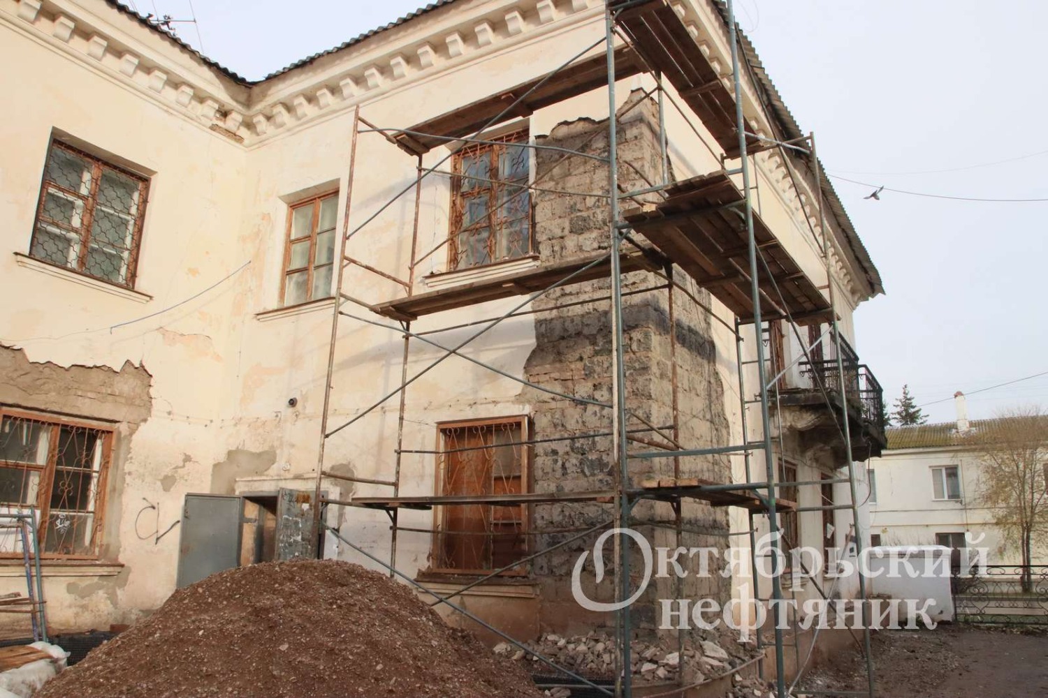 Сейчас здесь идёт ремонт. Горожане беспокоятся: сохранят ли украшающие главный вход здания декоративные элементы — пилястры, завершающие коринфскую капитель, барельеф и макет буровой вышки на коньке фронтона.