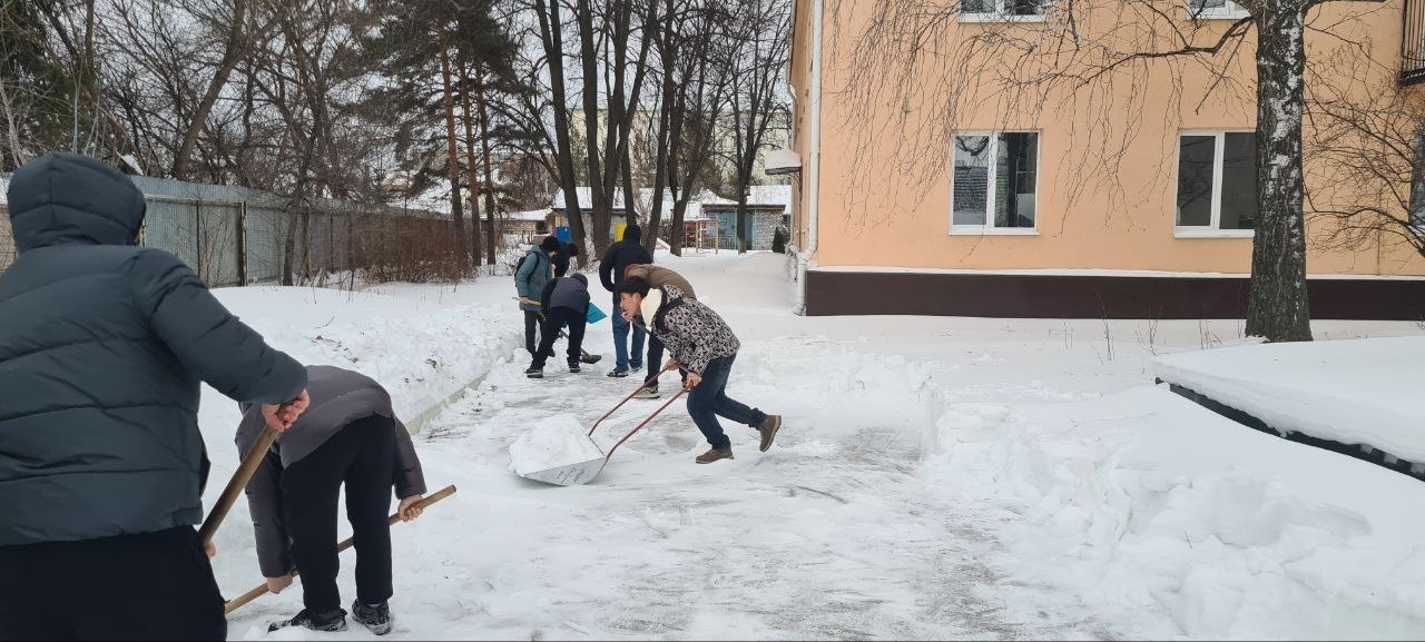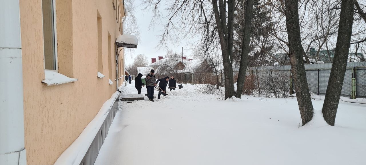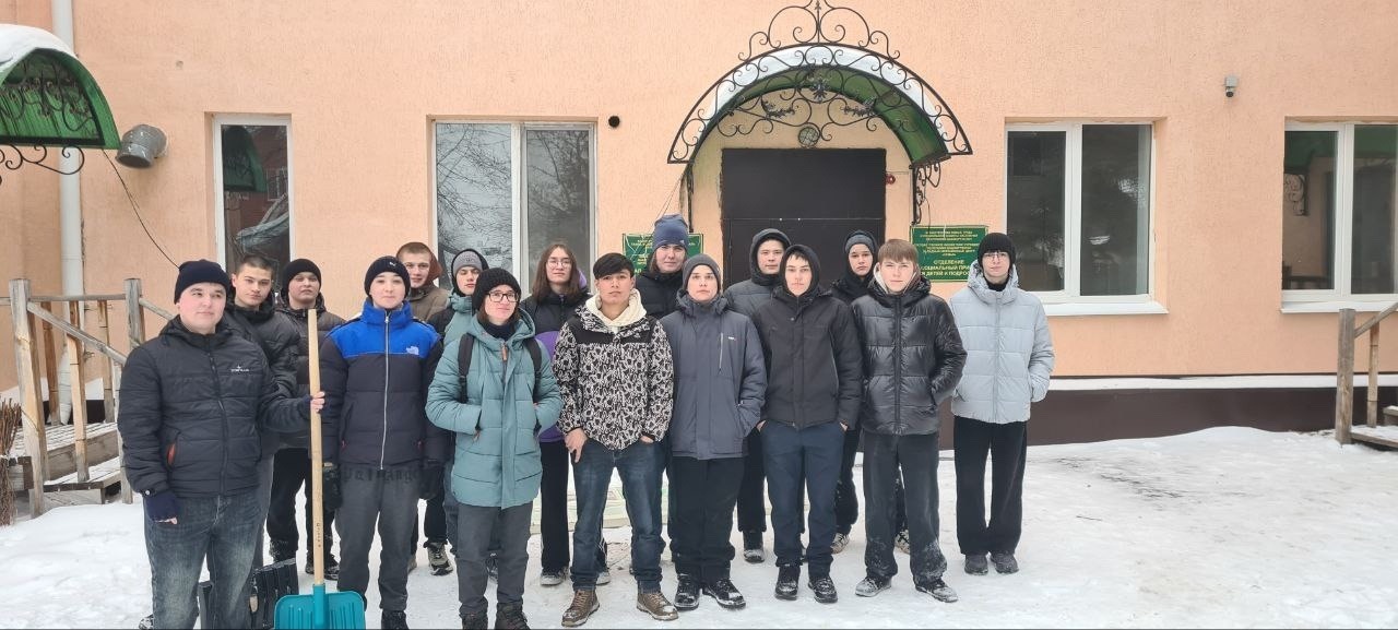 Волонтёры штаба имени М. М. Шаймуратова из коммунально-строительного колледжа помогли с уборкой снега на территории Отделения дневного пребывания Октябрьского дома-интерната для престарелых и инвалидов.