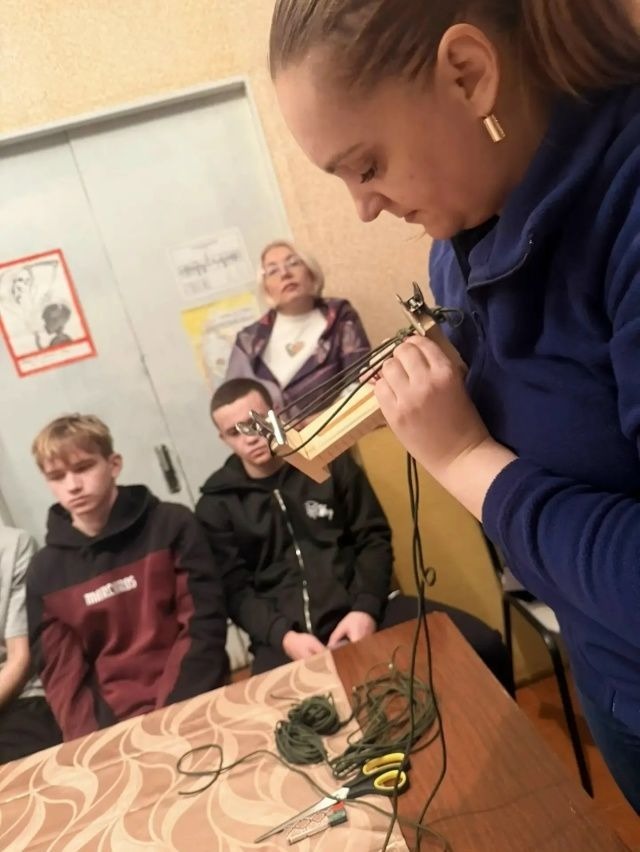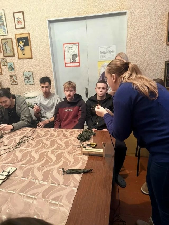 Анна Александровна провела для ребят мастер-класс по плетению «браслетов выживания». Молодые люди старались максимально точно повторить за ней каждый узел.