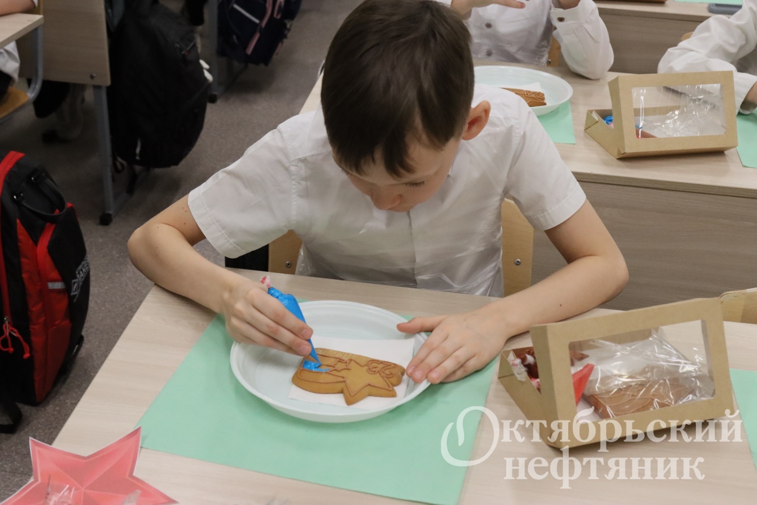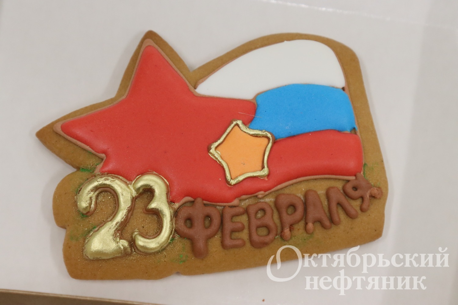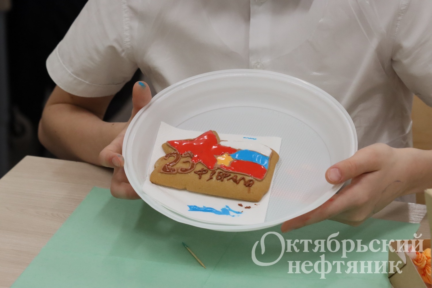 Контуры российского триколора, звёзды, даты — 23 февраля — на пряники уже были нанесены. Взяв в руки конусы с глазурью, ребята принялись за работу. У всех получалось красиво.