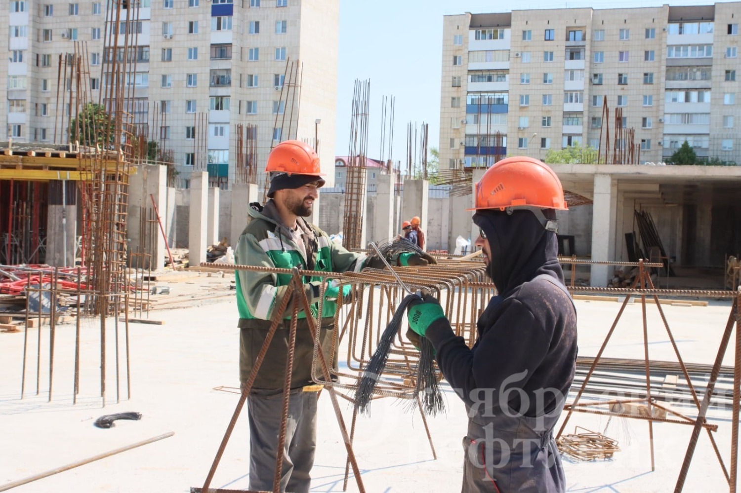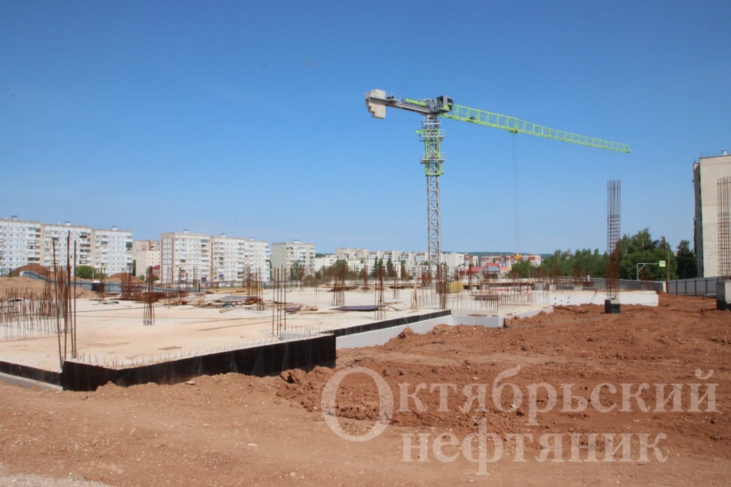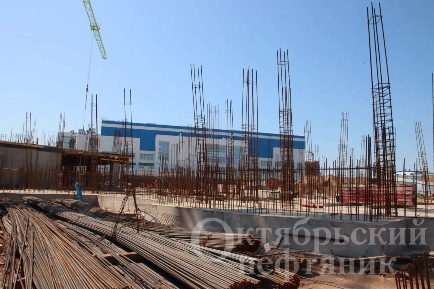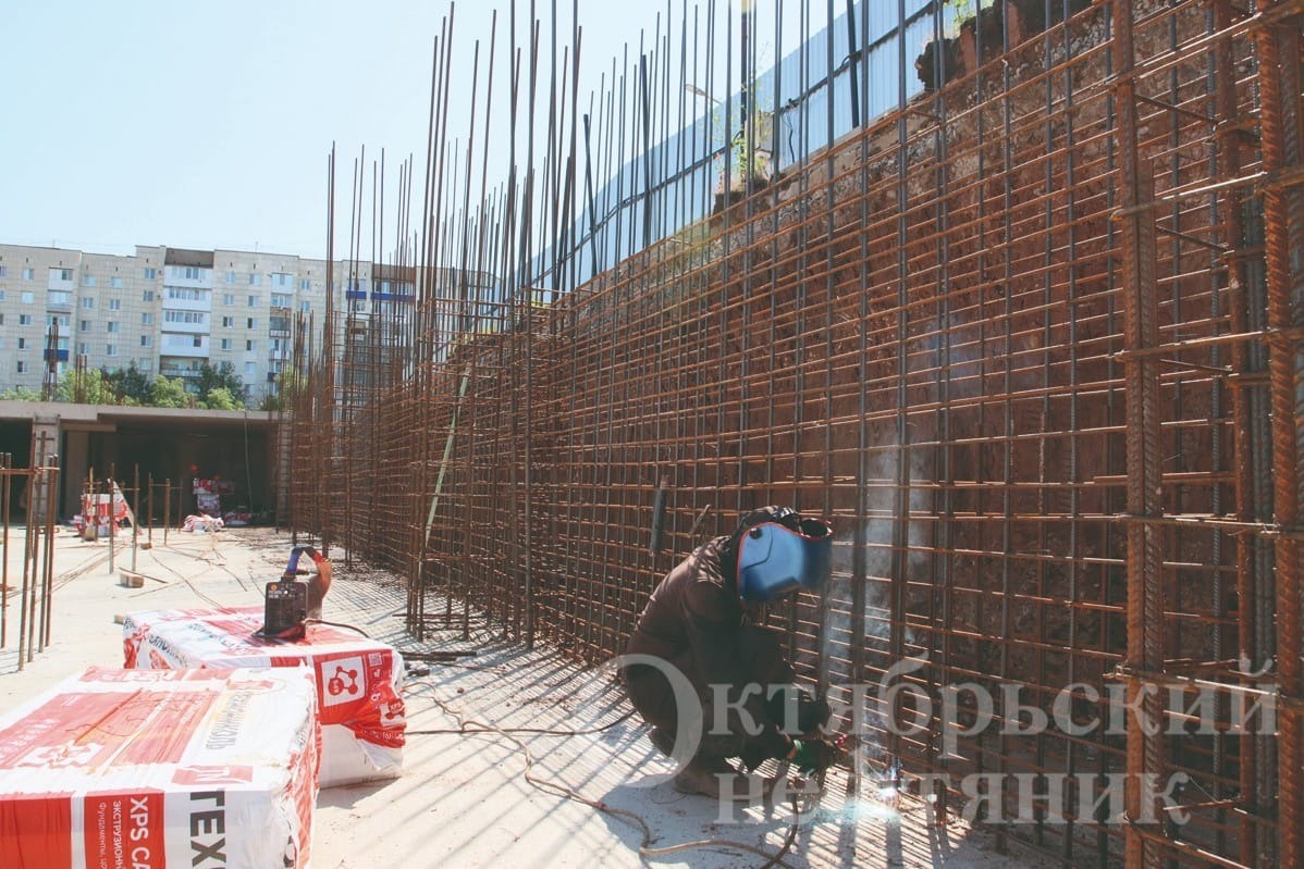 На части территории установлена фундаментная плита под бассейн. Сегодня на стройке в основном трудятся арматурщики и монолитчики октябрьского субподрядного предприятия ООО «МКМ‑ГОСТ».