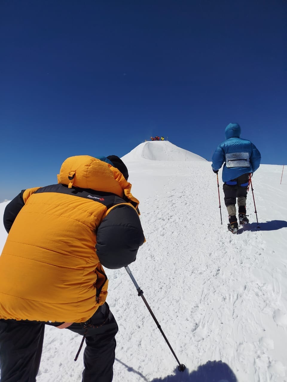 На высоте 5100 метров начинает пульсировать затылок, тяжело дышать, подъём кажется вечным. Каждые 50 минут делали небольшой 10‑минутный привал. Выше началась «Тропа зомби» — самый опасный участок с крутым склоном, по которому передвигались с ледорубом в руке и пристёгнутые карабинами к перилам так медленно, что издалека может показаться — люди просто стоят на месте. Передышки уже через каждые четыре метра.