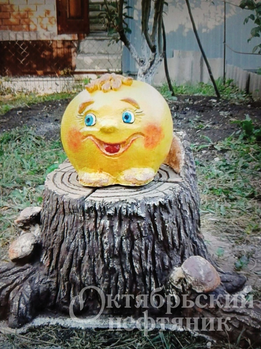 Ведро пластиковое сломалось. Покрыла его сеткой, потом раствором, разрисовала — пенёк вышел. Колобка на него посадила.