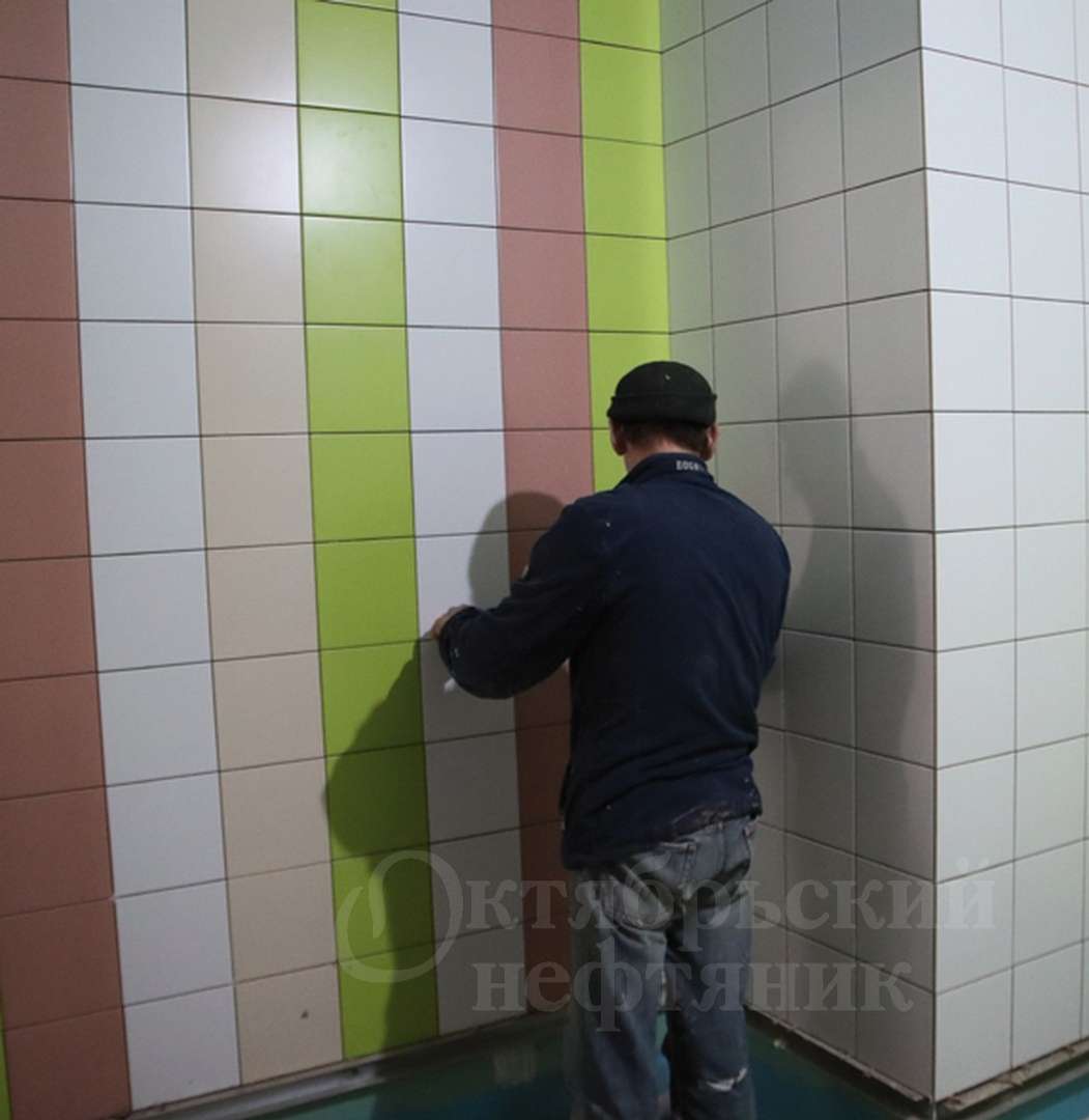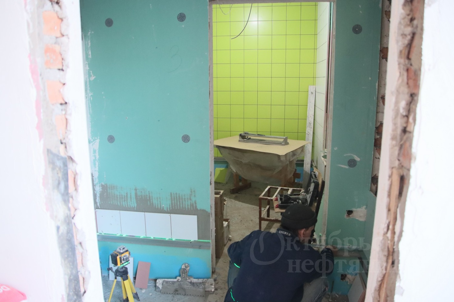 В санузлах учебного заведения укладывают настенную плитку. На втором этаже специалисты занимаются первичной черновой штукатуркой стен. Строители провели демонтаж старой кровли и готовятся к установке новой.