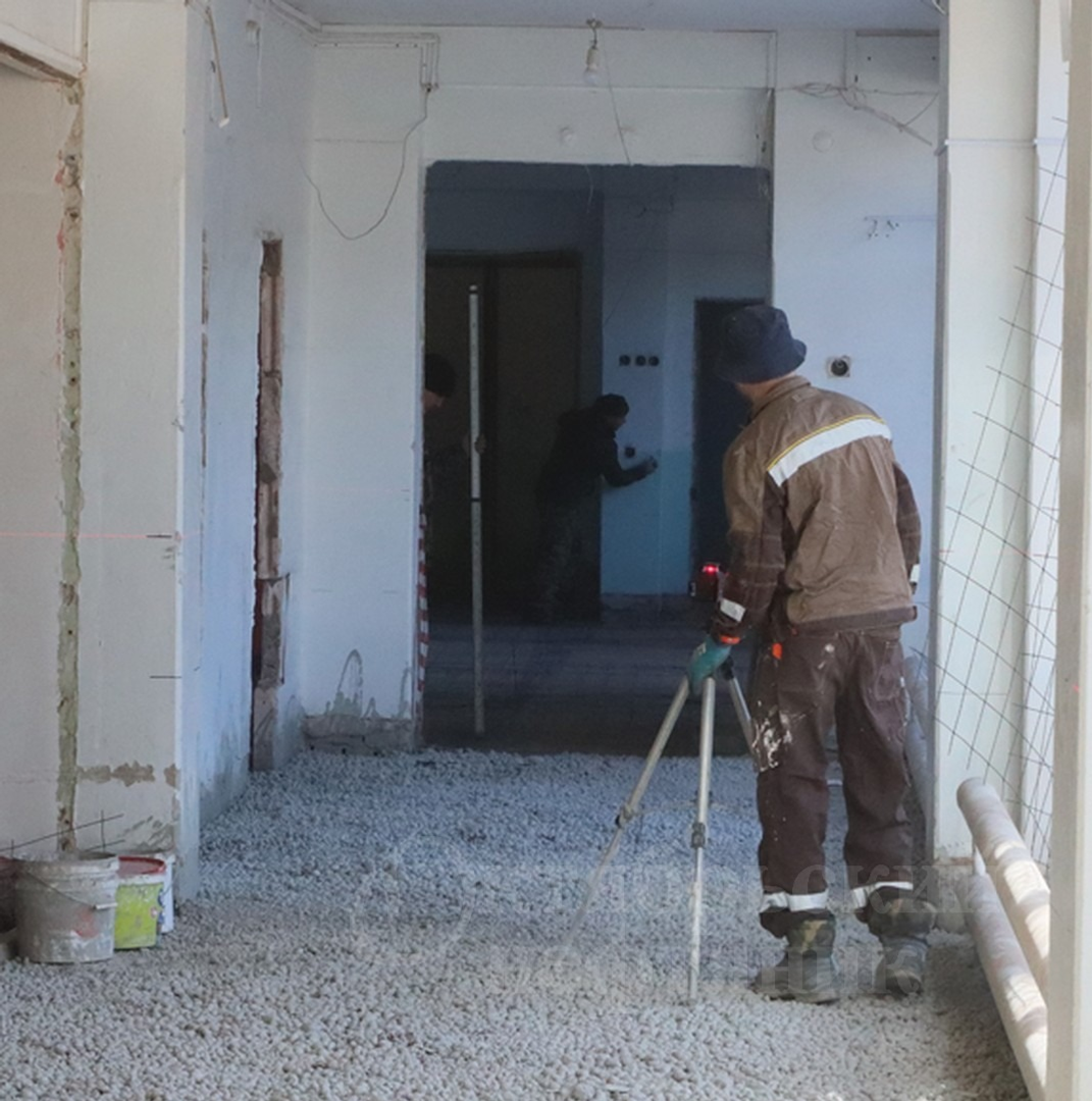 Что успели сделать к сегодняшнему дню? Полностью заменили окна на третьем этаже здания и частично — на втором. В эти укладывают полы керамогранитом на втором этаже. Продолжается прокладка электросетей: проведён их монтаж на всех трёх этажах школы, готовность составляет 70 %.