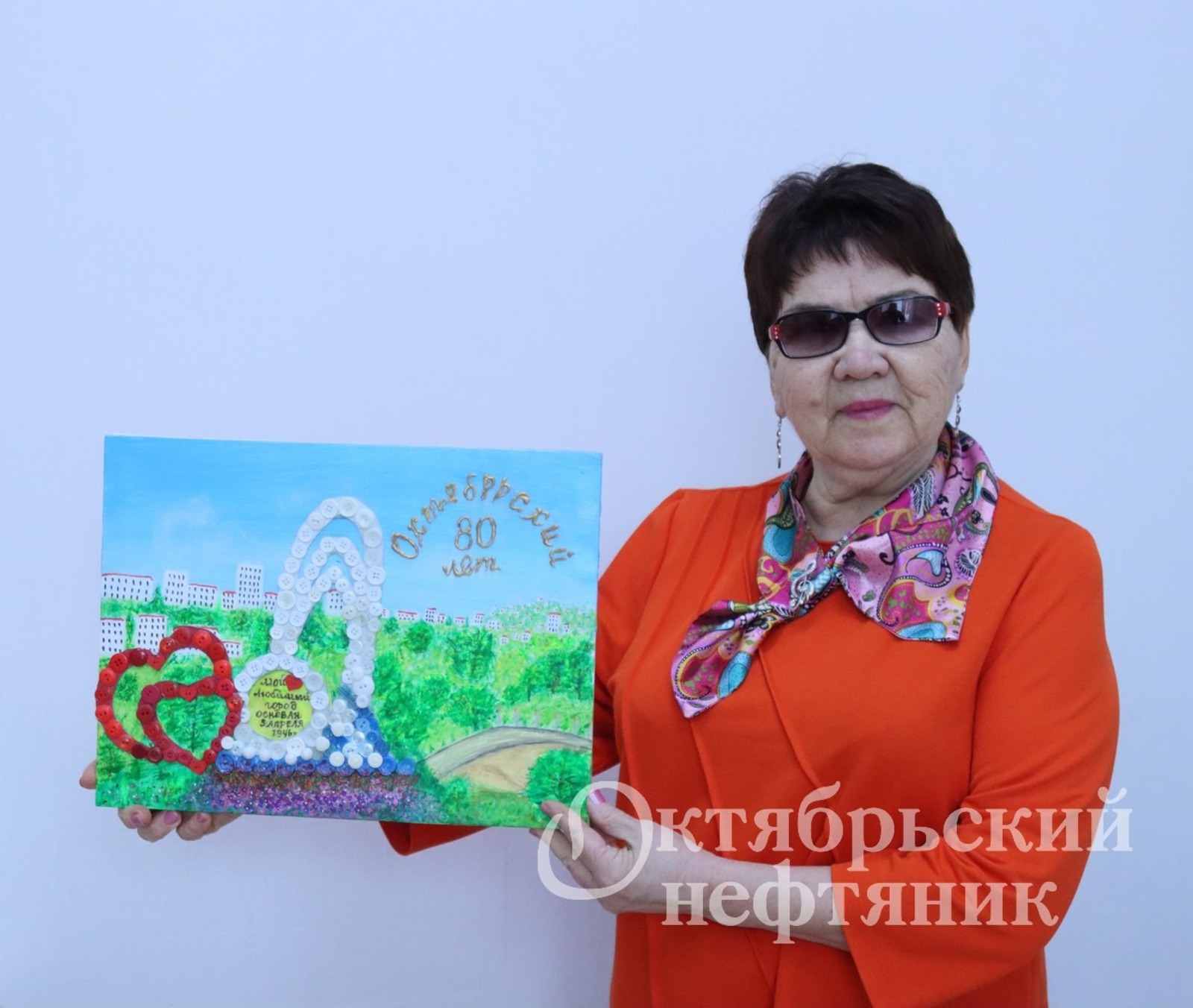 — Я долго думала, какую картину сделать в подарок к юбилею. Был холст подходящего размера. Наш город — это, конечно, нефть. Пыталась сделать вышки — они слишком чёрные. Чёрный цвет я не люблю, это некрасиво.