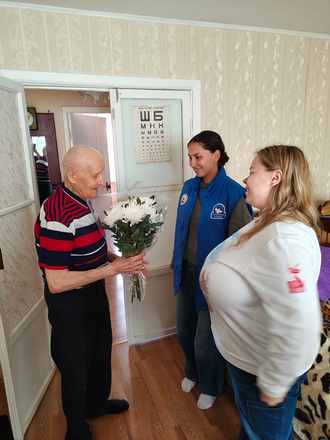 Поздравили почётного гражданина Октябрьского с праздником представители движения «Волонтёры Победы» из Дворца молодёжи.
